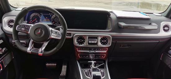 2019款全新G63内饰方面,新G63保留了新G500的整体设计,除配色差异外,新车还换装了全新造型的平底式AMG运动方向盘,其两侧配以打孔皮质包裹,下部镀铬装饰的造型也与新G 500明显不同,看上去十分战斗。此外,全液晶仪表盘+中控大屏的双12.3英寸屏幕设计在新车上也没有缺席,营造出了浓郁的科技感。
