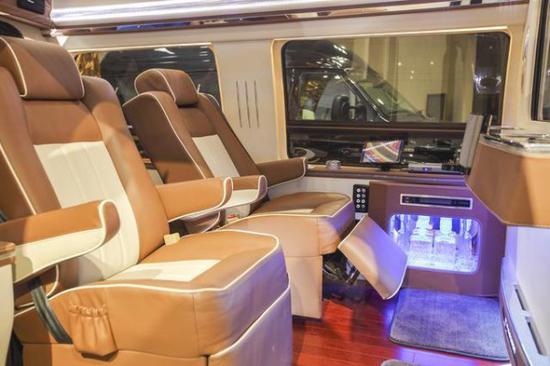 GMC商务之星的舒适程度确不亚于豪华轿车,用料高级,配置丰富,做工标准也和后排形同,暖色系的棕色真皮与桃木饰件,彰显了GMC的高雅与奢华。车内的设备一一俱全,精致的吧台,采用可升降32寸车载电视,国际顶级bose音响,车载冰箱及镶嵌式酒柜,真皮桃木饰件,高档防水游艇木地板,电动窗帘,全景天窗以及舒适的航空座椅、电动沙发座椅,无处不彰显着高端奢华的品味。