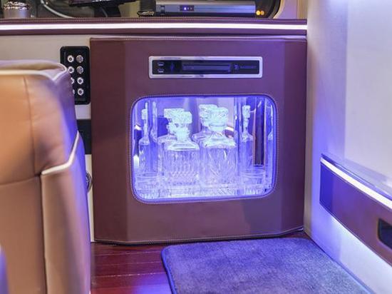 全车上大面积的都是采用了深色原木的饰板,还有浅米色设计的皮质,车顶的设计是影院式的星光式的设计,坐进去以后就像是坐进了电影院里。毛绒绒的地毯使整个车充满了非常大气的风格,而且地毯式搭配的长粒的,第一次乘坐这款车的乘客是非常有震撼力的。