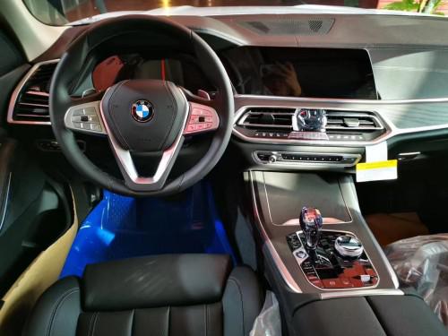19款宝马X7内饰部分,宝马X7采用最新家族式设计语言,使用大量真皮、木纹饰板进行包裹。配备12.3英寸带有注意力检测的全液晶仪表和12.3英寸悬浮式触控显示屏。空调出风口与温度显示屏、实体功能按键结合在同一区域,并使用银色装饰条进行点缀。下方盖板下方为带有加热、制冷功能的杯架,全新的水晶电子挡杆造型十分精致,进一步提升了车内的豪华氛围。