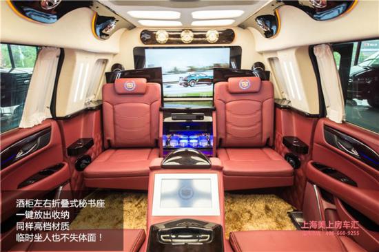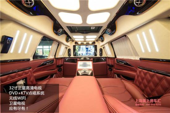内部的布局也是奢华与科技并存,得以于近6米的车身,内部空间也是十分的充足,前排搭配2个电动折叠座椅,座椅收起后会跟多功能实木吧台融为一体,形成更大的豪华吧台。内部配备了真皮桃木内饰、高级地毯。32寸三星高清电视作为可升降分隔屏,方便与前方乘客沟通,如果麻烦,座椅旁边也有对讲电话,保护后排的隐私。