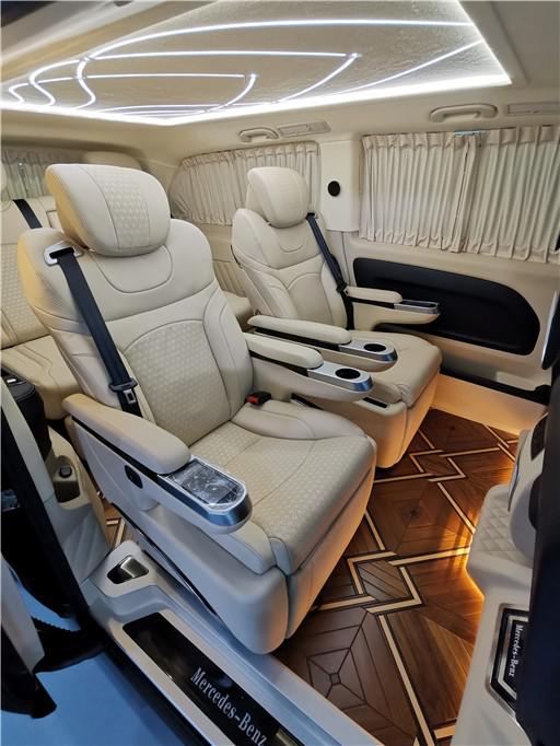 奔驰新威霆房车的后舱二排座椅为2张迈巴赫S级 (配置|询价)航空首长席座椅,带座椅加热、通风、气动按摩、一键展开呈135°人体工程学睡眠角度、一键收回、多向电动调节、调节记忆等功能,堪称卧于太空的舒适乘坐感受!