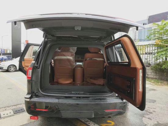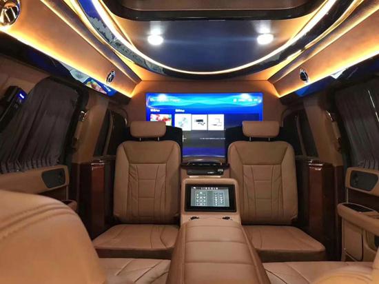 由于2019款林肯领袖一号的内饰是要经过重新设计,纯手工打造,那么我只能借助上一代领袖一号的内饰来给大家做对比。通常像领袖一号这种加长商务越野,内饰布局上前后舱隔开设计,隔断上配置升降电视。座椅则是对坐设计,再通过各种巧妙的设计,让各种电子设备融入车内。