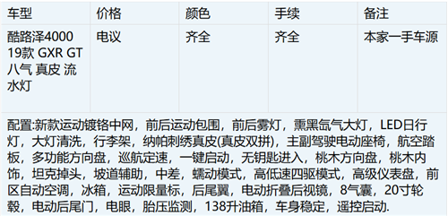 19款中东版丰田酷路泽4000GT 作为沙漠之王,酷路泽系列的动力绝对可以满足众多喜好越野一族人群的需求。丰田酷路泽4000参数:长*宽*高(mm):5095*1970*1930 轴距:2850 mm载质量:2600KG 轮胎规格:285/60R18最大扭矩:376NM/3800RPM 变速箱形式:6挡手自一体变速箱(注:17款为5档手自一体)油箱容积:138L 气缸排列形式:V综合油耗:10.99/100KM 驱动方式:全时四驱发动机位置:前置 最高车速:190KM/H气缸数:6 每缸气门数4 马力275。