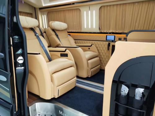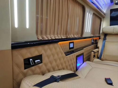2019款进口奔驰斯宾特商务房车整车尺寸5910*1993*2800mm,车内空间宽阔,整洁美观,真皮制作,柔软舒适,驾驶舱与乘客舱全隔断分开,但雾化玻璃解决了互通的问题,乘客舱独立座椅具备电动加热、按摩、通风等功能,可多方位调节,后排沙发座椅可以平躺成床,中排与前排之间可以添加桌板,成为移动办公室,车舱顶部配置LED灯光七彩变化,遥控控制定格颜色,可以是功成后的祝贺模式或放松心情的治愈模式。