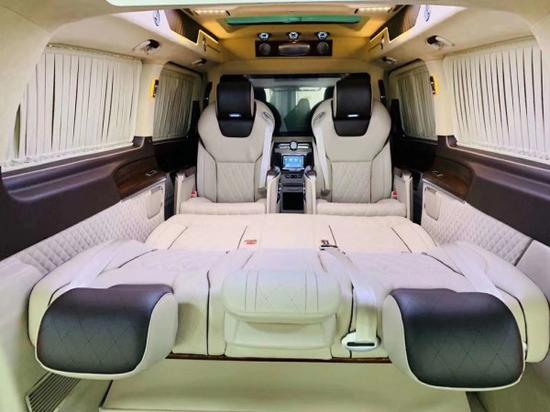 进口迈巴赫VS680采用隔断式吧台,32寸可升降液晶电视,吧台中间镶嵌一块万国表,全车真皮包裹。整台车采用了前后无隔断的设计,隐私性稍差空间性更好,便于商务接待的同时兼顾家用,定制风格采用经典的迈巴赫元素,宽大的航空椅配上迈巴赫舒适头枕,坐在上面就想美美睡上一觉。座椅带有8向的电动调节,超长的腿拖和按摩功能。无论出游还是商务会谈都十分凸显逼格儿!