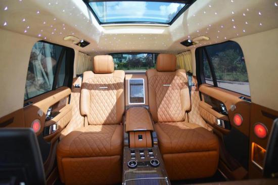路虎揽胜皇家一号兼具豪华气派与运动风格,中控双彩色液晶大屏,集成系统触屏控制,升降式的换挡旋钮,麂皮车顶,空调分区,内饰十分豪华,搭配实木装饰,布局也更为简约,采用了全新四幅方向盘设计,座椅采用菱形走线非常讲究手工的工艺,前排座椅同时支持电动调节和加热通风的。