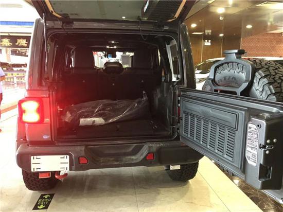 牧马人2.0T车外后视镜的壳体上设计了两排LED灯组,目的是为了弥补侧面的照明,视觉效果很有型,不知道实际照明效果如何。这是一辆吸取战斗机元素而设计的牧马人,发动机舱盖上的两个加特林机枪其实是进气口。