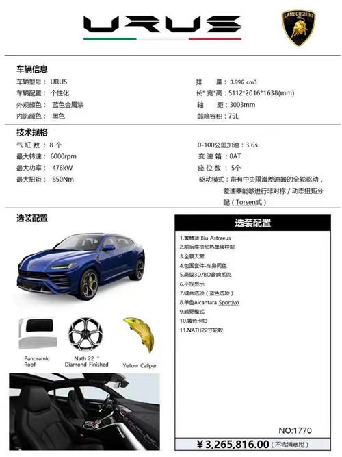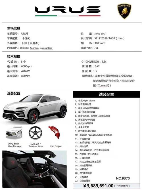 2020款兰博基尼Urus在其中一些材质上还可以采用考究的对比缝线或Q-citura缝线。在至今所有的兰博基尼之中,Urus配备有最为全面的可选配置,让多样化的风格汇集在一款绝无仅有的车型之中。不仅如此,兰博基尼Urus也是首辆5人位超级跑车。