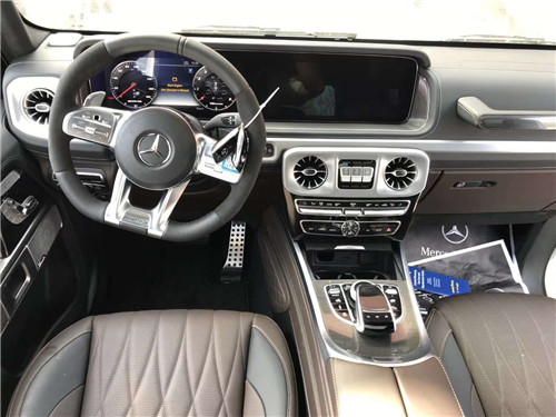 奔驰G63在内饰的豪华度上更上了一步,中控台给驾驶员的视觉冲击力更深了一步。2019款奔驰G63车内应用了更多创新技术,还配备了带彩色TFT显示屏的AMG仪表盘、AMG主菜单和单独的挡位显示器以及采用白色照明的AMG门槛。