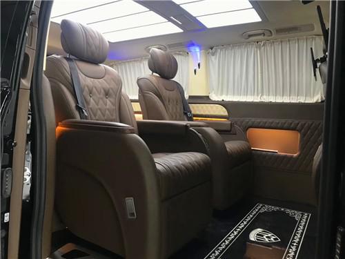 新车内饰拥有TEMPMATIC自动恒温空调系统,用冷暖气出风口分离技术,能够完全闭合或开启,可更好的分区控制车厢温度,满足不同乘客的多方面需求。驾驶舱正副驾驶座椅采用真皮制作,且带有车载冰箱。该车为无隔断式内饰改装,整车配色大气温馨。车壁有便于商务行程中即时文件处理的隐藏式小桌板设计,可时时办公使用。车顶采用了全景天窗以及,满天星顶棚设计,车内照明,要多明亮有多明亮,不会产生丝毫刺眼的不适应。