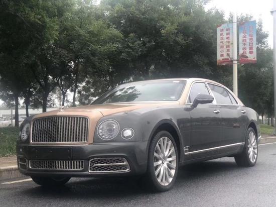 2017款宾利幕尚加长 车架号:2511 颜色::玫瑰金混磁铁灰 / 米色配海豚灰 状态::森扬现车手续齐 配置:天窗、穆勒包、前后座椅通风按摩、后娱乐、高级音响、小桌板、宝石油箱盖、车库遥控器、两把雨伞、泊车钥匙、四座、前后地毯、冰箱、GPS、数字电视、后座可折叠办公桌。