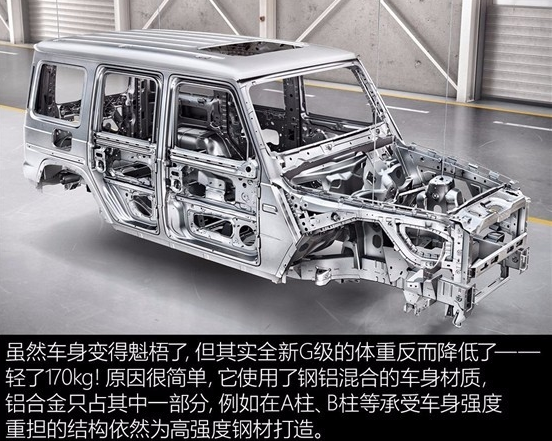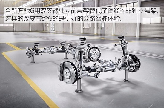 19款G63前悬改为双插臂独立悬挂、电子助力转向、更大的内部空间、新仪表盘和多项奔驰最新的电子安全系统。车体增宽了122mm,轴距增加40mm达到2890mm,整车加长了53mm。老款奔驰G能用德军的直升机运载,现在加宽了122mm,希望还能装得下。