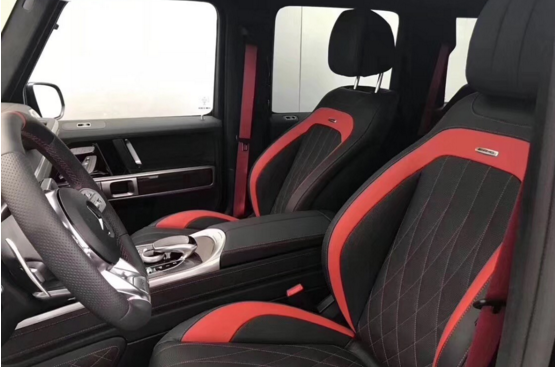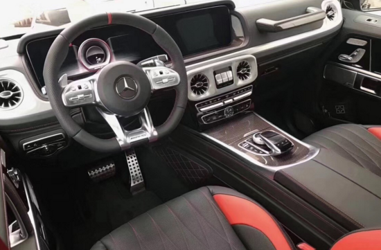 内饰方面其实才全新一代G级最大的变化。新车换上了奔驰最新家族式的内饰设计,这无疑让G级拥有了旗舰 级应有的豪华感,不过经典的副驾驶席扶手和三把锁的开关键依旧延续了经典设计,并设置在中控台最显眼的位置。其中双12.3英寸高清屏,虚拟仪表盘与中控液晶屏融为一体,视觉上形成一个宽屏驾驶舱,中部的涡扇式空调出风口也颇具设计感,还大量采用了皮革的包覆。另外,新一代G级还对驾乘空间也进行了优化。