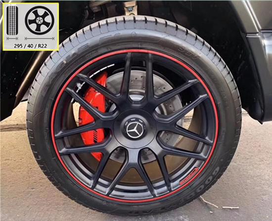 2019款奔驰G63锻造轮圈为其带来了更轻的簧下质量和更高的强度,由Y字形辐条组成的轮圈,极具视觉张力,亚光黑色喷涂搭配一圈红色线条很有运动氛围。巨大的对向6活塞卡钳能为这台2吨多的怪兽提供足够的刹车力。