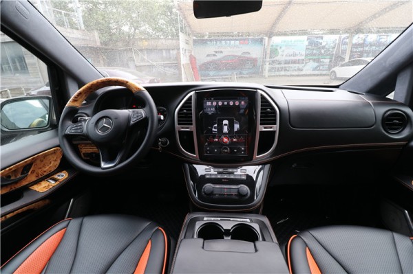 进口奔驰7座商务车Metris的地板选用美观耐磨的柚木地板,在B柱配有两个精致的氛围射灯,电动滑门处也都用钢琴烤漆饰板装饰,细节非常考究。顶部采在车灯采用迈巴赫式的宫格顶。