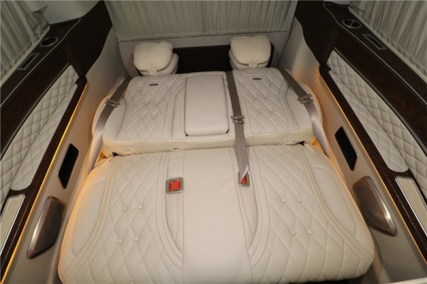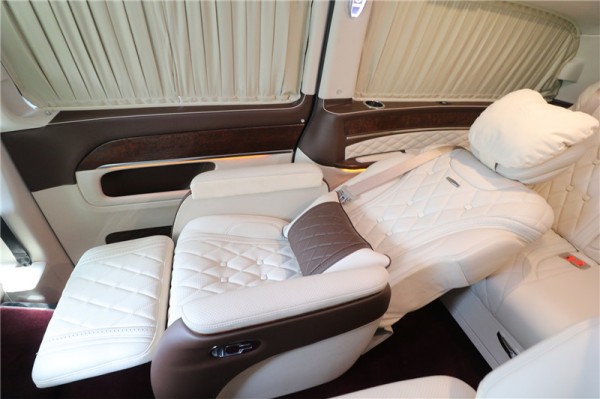 新款国六奔驰商务车VS680乘客舱第二排多功能座椅,可旋转,并带有脚托功能,舒适乘坐,附有加热、通风、电动调节、腿托、按摩、记忆、电动头枕、电动靠背等功能,座椅支持180度旋转。新款国六奔驰商务车VS680车顶采用双天窗加迈巴赫宫格顶灯配置。无隔断的设计,使得车内的空间视野最大化,不会有压抑感,也方便了车内的沟通交流。
