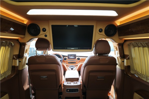 奔驰商务车V260L新款车身内壁全部采用进口皮革包裹,经过手工股线缝制,舒适感达到极限。无隔断座椅布局采用的是2+2+3的七座配置。尤其是第二排的两张航空头等舱座椅,采用顶级面料与柔软适中的填充物,并且具备通风加热,按摩,腿托,多向调节等功能矩阵。
