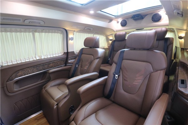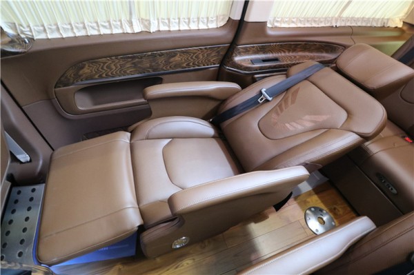 前后通透的设计格局,使整车空间感更大合理化,内饰的设计是婉约柔和的,这款国六奔驰V260L商务车整个采用米黄为主色调,更显淡雅清净。宽大的航空椅配上全新的智能调节触控屏,使整车更加具有现代科技感。座椅带有8向的电动调节,超长的腿拖和按摩功能。