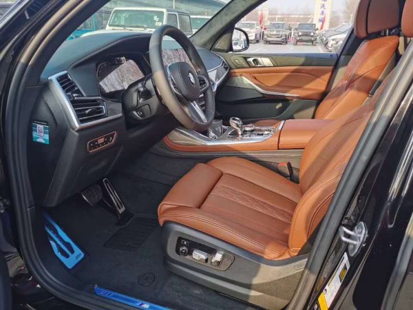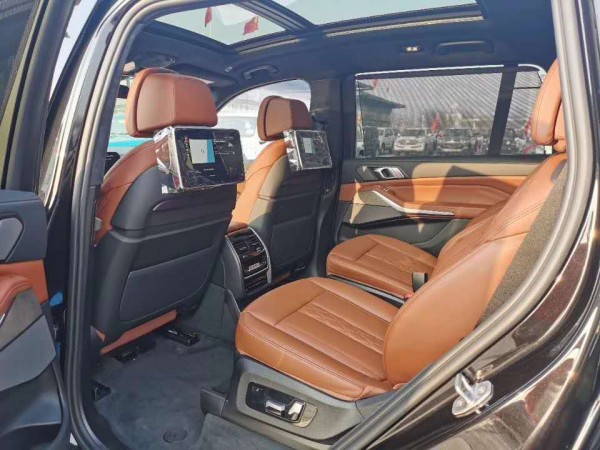 内饰部分,宝马X7采用最新家族式设计语言,使用大量真皮、木纹饰板进行包裹。配备12.3英寸带有注意力检测的全液晶仪表和12.3英寸悬浮式触控显示屏。空调出风口与温度显示屏、实体功能按键结合在同一区域,并使用银色装饰条进行点缀。下方盖板下方为带有加热、制冷功能的杯架,全新的水晶电子挡杆造型十分精致,进一步提升了车内的豪华氛围。