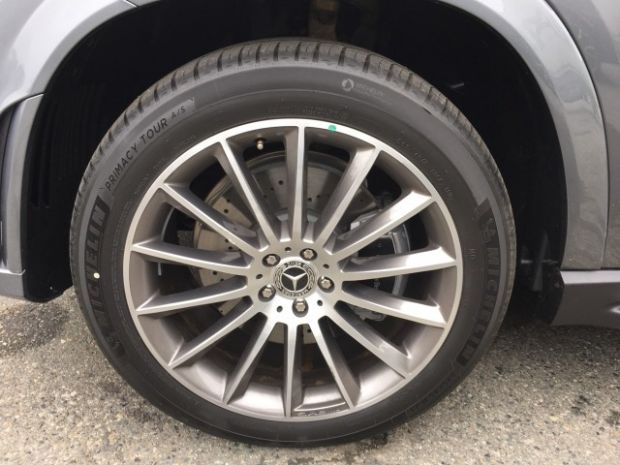 进口版奔驰GLE350车型采用了20寸双五幅轮毂,枪灰色表面还有AMG标志,匹配马牌轮胎,规格为275/50 R20。