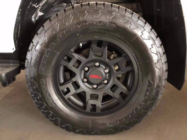细节方面,作为一款地地道道的越野车型,轮眉提升角度较大,与轮胎之间的距离足以满足您在不同的路面随心驰骋,加之锻造式的轮毂,非常的坚实,碰到石头几乎是没有问题的,匹配的是越野式的轮胎,可以适应各种路况,可以提供很好的摩擦力