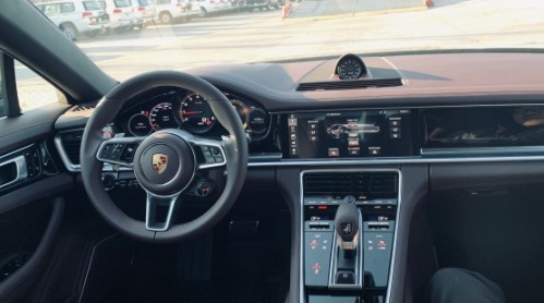 2019款保时捷帕纳梅拉4S式仪表盘,具有液晶显示屏的行车电脑显示功能,超大液晶显示屏配有倒车雷达模拟图像。还有可以在每个弹簧中按需提供额外充气量的气动悬挂系统,可自动升起且角度可调的后扰流板,确保了主动空气动力性能。另外,新一代PCM保时捷通讯管理系统在中控台上整合了尺寸更大的液晶屏幕。 传统位于中控台的空调系统与警示灯等按钮,都转移至排档座区块。众多控制按钮以深色底板辅以细条镀铬的对称排列设计成为保时捷中控台造型的一大突破。