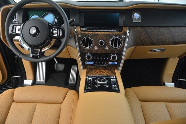 内饰融合了纯正的劳斯莱斯式的奢华和简洁,展现了对称的功能之美。中控面板的边框由手工打磨的金属条包裹。上部仪表板采用全新研发的现代“方格粒纹”黑色真皮包裹。