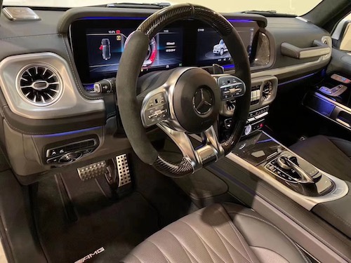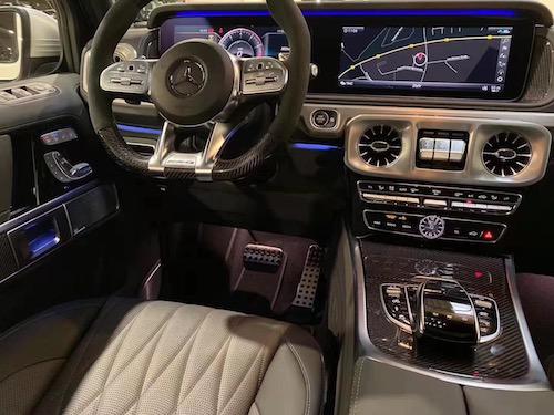 19款全新G63内饰方面,新G63保留了新G500的整体设计,除配色差异外,新车还换装了全新造型的平底式AMG运动方向盘,其两侧配以打孔皮质包裹,下部镀铬装饰的造型也与新G 500明显不同,看上去十分战斗。此外,全液晶仪表盘+中控大屏的双12.3英寸屏幕设计在新车上也没有缺席,营造出了浓郁的科技感。