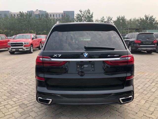 19款宝马X7车身侧面上方配有黑色行李架,前翼子板下方为长条状空气导流槽,腰线较为低矮且呈上扬之势,选用21英寸双五辐式拼色轮毂。车尾造型方正,LED尾灯组与粗壮的银色饰条贯穿相连,采用上下分段式电动尾门,排气采用双边共四出式布局,保险杠下方两侧配有大尺寸镀铬尾喉装饰。