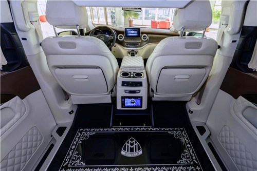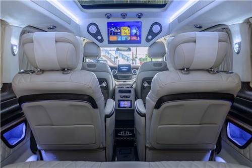 。V260L版以下是贵宾舱二个总裁座椅,这二个座椅具有记忆功能,何为记忆功能呢?就是一键展开及一键收回,这个座椅是根据人体工程设计而成,能一键式找到您身体最舒适的角度。在总裁座椅双侧有两个隐藏式桌板。总裁座椅中间有个热感电子触摸屏幕可控制后舱设备,屏幕下方有个“语音控制系统”也可控制整个贵宾舱的设备。