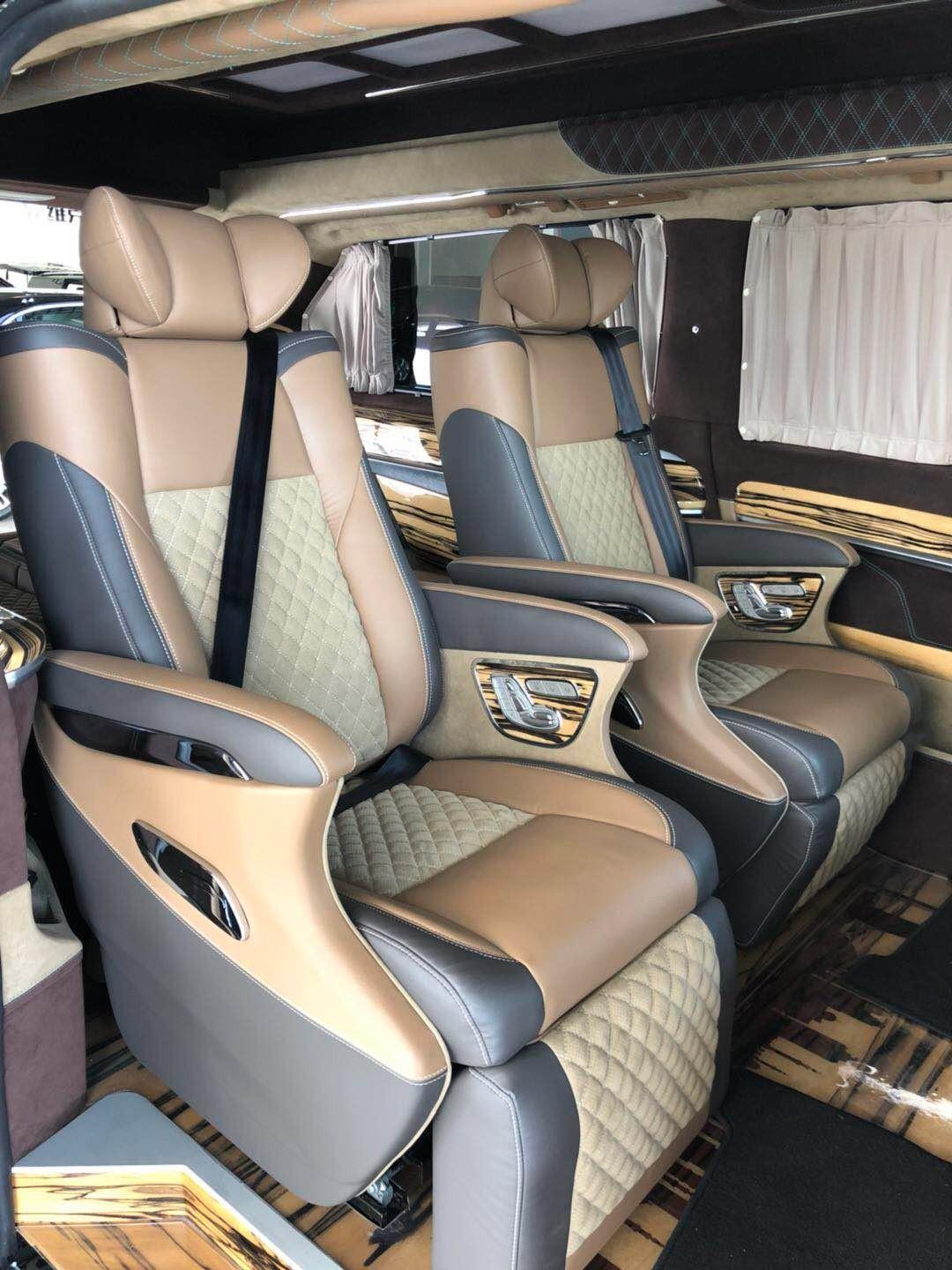 整车共六座,其中后车舱为四座对坐格局,大量进口虎皮檀木包裹的豪华吧台隐藏了两张一键式展开座椅,虽不比航空头等舱总裁级真皮缝制的座椅具备多项调节,通风,加热,气动按摩等贴适人心的诸多功能,但精细设计的吧台座椅舒适度比一般轿车座椅要高。华丽酒吧柜之上还安置了一台32寸升降式高清电视,搭配日本健伍5.1影院级音响系统,随时随车享受品质天籁。在总裁座椅两边还有隐藏式DVD,指纹识别的便携式保险柜,方便商务文件,贵重物存放。座椅旁定制的小桌板以便辅助您展开办公,休闲等活动。限量定制,不只是豪华与奢侈,更是舒适的生活方式。