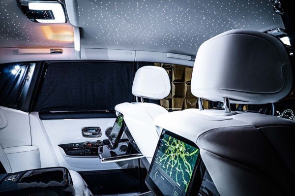 劳斯莱斯幻影车内采用的皮革隐隐地散发着牛的气味,在幻影车上,公众还能看到最高水准的手艺和最优质的材料。坐在左后的乘客欠身去取放在副驾驶的某种物品,这样左后车轮就会受力变小,减震器的传感器会迅速回馈给控制电脑,在不知不觉间达到力传递的完美过渡。后排乘客舱增加了 2500mm腿部空间,从而不仅提供了宽敞的休闲空间,更增加了实现客户定制的可能性。这是一个能让您感到备受尊宠的私人空间,既是极佳的工作场所,亦适合在约会间隙放松身心。