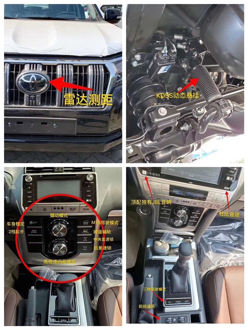 配置:限量棕色内饰真皮,18熏黑轮毂,巡航定速,车身稳定,防抱制动,蠕动模式,多地形选择模式,拖车摆动控制,行李架,LED氙灯,大屏导航,倒影,炫彩仪表盘,360环车影像,无钥匙进入,一键启动,电眼,雾灯,三排电动折叠,自动空调,天窗,9气囊,冰箱,前排电动座椅,电动方向盘调节,前排座椅通风,双差速锁,并道辅助,三种驾驶模式,预碰撞雷达测距,车道偏离预警,KDSS动态调节悬挂系统,JBL音响14个喇叭,杜比音效,坡道辅助,胎压监测,远程遥控启动,大灯清洗,电动折叠后视镜,彩条,150L大油箱,后挂备胎。