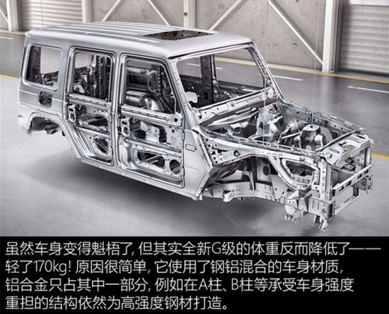 车身尺寸: 19款G63前悬改为双插臂独立悬挂、电子助力转向、更大的内部空间、新仪表盘和多项奔驰最新的电子安全系统。车体增宽了122mm,轴距增加40mm达到2890mm,整车加长了53mm。老款奔驰G能用德军的直升机运载,现在加宽了122mm,希望还能装得下。