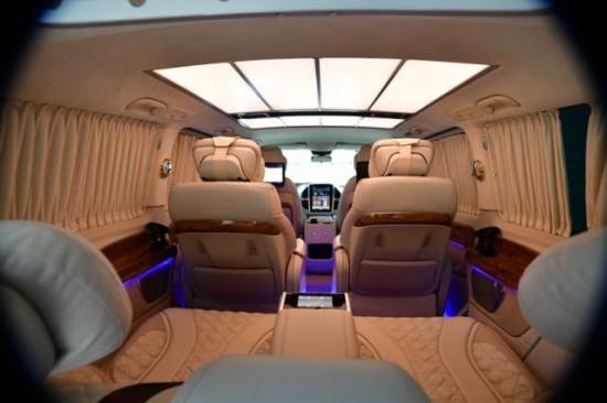 进口奔驰迈特斯商务车可通过中控台按键多种方式自由操控,乘客舱前排首长级多功能按摩座椅带脚托,设计了滑轨,可自由电动移动和收缩,适应多种身高、体型的乘客,多种坐姿任君挑选,将舒适惬意延伸到车内每个角落,娱乐影音配备齐全,吸顶高清液晶电视,需要时可以往下翻,按钮一按,最新热点、时尚资讯随时掌握。