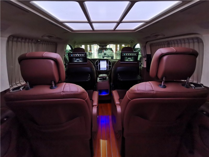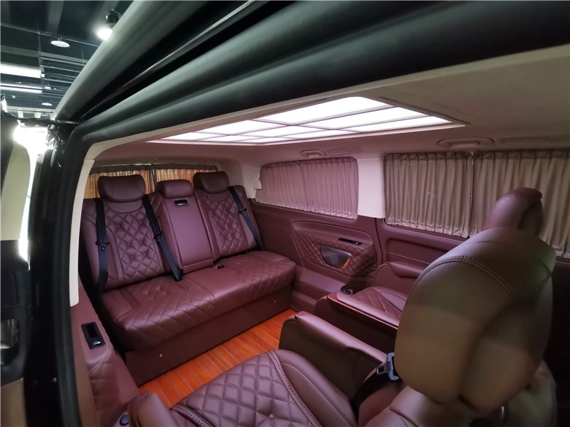 奔驰威霆内饰改装图第三排选用三连坐式规划,可电动放倒成床,本款第三排座椅自带通风,加热,按摩,回想等多种功用,是其他第三排座椅望尘莫及的。