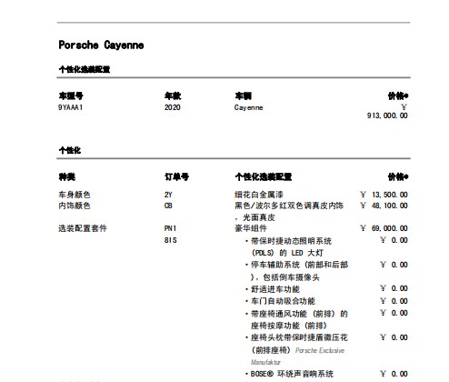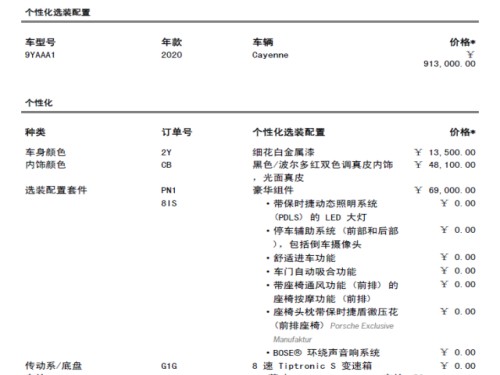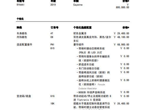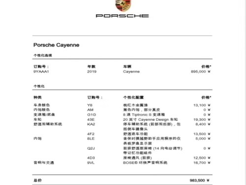 2019款中规版保时捷卡宴 (配置|询价),指导价913000 国六版即将到店,华北地区最大的保时捷代理商,全国最低价格,全系接受预定,详细配置清单及颜色请咨询文章下方销售电话。