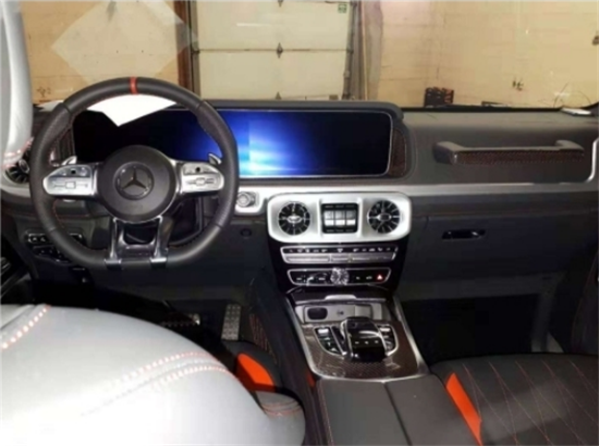 19款 Edition 1 限量版奔驰G63在内饰方面,选装了特殊的碳纤维内饰(红黑相间),以及方向盘红色拼接,红色安全带,以及限量版的座椅。