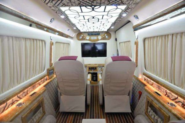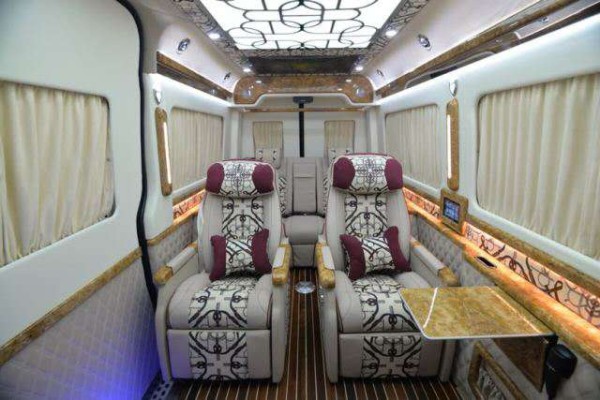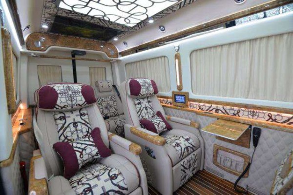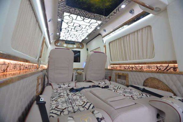 奔驰斯宾特云锦版全车2+2+2+3座椅排列顺序,前排首席是两个顶级配置的总裁航空座椅(通风 加热 按摩 腿托 座椅记忆 座椅一键式还原 前后移动),扶手处采用澳洲鸵鸟皮,头枕、靠背处采用了造价昂贵的云锦装饰,古老的东方艺术,结合奔驰的现代工艺,将奢华推向极致。两分式棚顶设计,前部分为中国风铜钱灯,后部分为璀璨星空,全景式顶灯投射下,浪漫紫色,搭配豪华游艇钟装饰,无与伦比的视觉盛宴!