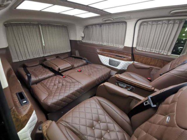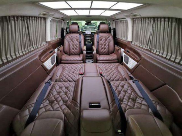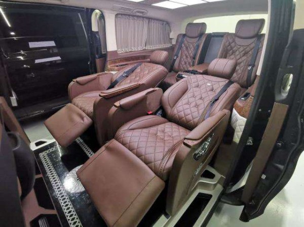 20款进口奔驰V250迈巴赫版商务车全车多层隔音棉降噪,Alcantara麂皮绒顶,顶部是巴洛克式可变光内顶灯,车内两侧带有奔驰logo的门控立柱灯,底部是AM定制铝质高光花池地板和四季实用透明环保地膜。