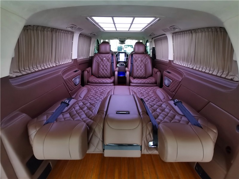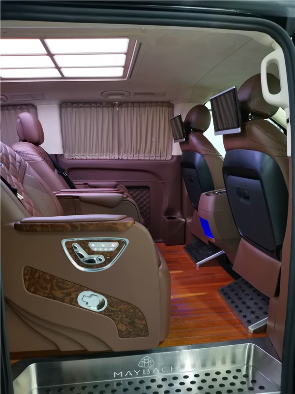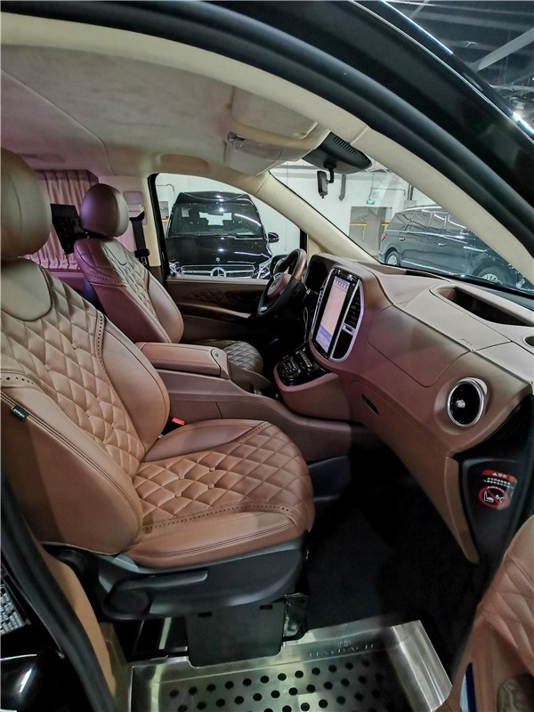 奔驰威霆7座简约版改装后舱,立刻就会被它的豪华绚丽而征服,整车环保真皮包裹,游艇级柚木地板铺设,豪华感无处不在。全部采用真皮制作,豪华木饰装点,带有按摩加热通风功能。后舱前为两个独立航空座椅,第二排座椅安装进口首席航空座椅,加热通风按摩功能齐全,最大限度的减缓您的乘车疲惫。八向电动调节:电动头枕,电动腿托,前后电动调节,电动靠背调节。第三排为一组沙发座椅(可电动展平,形成一张舒适的沙发床)。