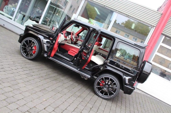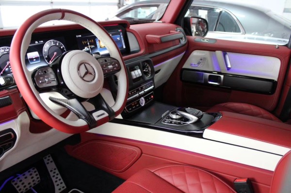 Brabus 800 Widestar前脸换装由12根竖置镀铬饰条组成的进气格栅,两侧为圆形LED大灯组,前保险杠下侧的进气口相比普通版车型尺寸更大,整体极具侵略性***车身侧面装配23英寸的多辐式运动型轮毂,匹配大尺寸制动卡钳,排气依旧为双侧边共四出式设计,尾部配备式全尺寸备胎及较为实用的拖车钩,顶部装有LED高位刹车灯。
