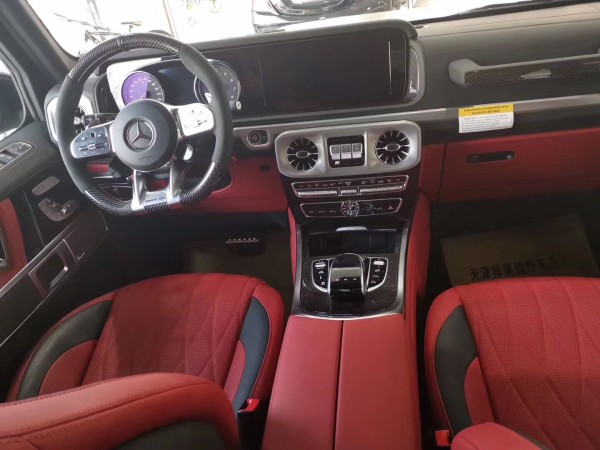 2020款奔驰G63 (配置|询价) AMG内饰方面,展现一幅豪华做派,三幅式加热方向盘、仪表盘与中控屏采用连屏设计,视觉上非常有科技感。另外车内还有柏林之声音响、64色氛围灯、大天窗等高端配置功能,这里就不一一为大家介绍了,车内还使用了碳纤维内饰点缀,看上去很有运动氛围,同时圆筒式的空调出风口和副驾驶前方的扶手,进一步展示了它的的越野风格。