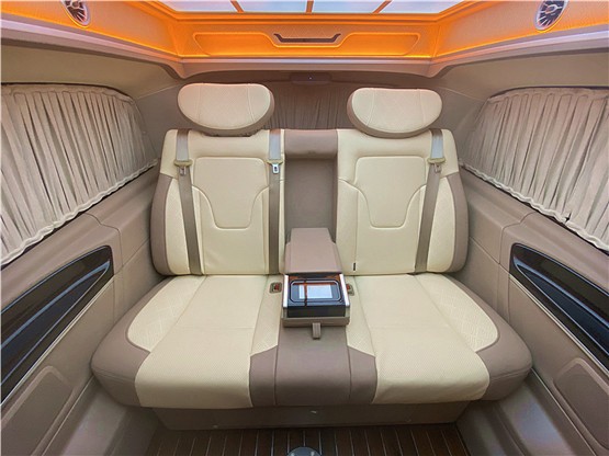 20款奔驰威霆商务车车顶采用迈巴赫元素顶灯设计,第三排座椅宽大柔软,头枕的支撑非常棒,可以通过中央扶手箱处的触控屏幕将整个座椅可支持一键放平成床,旅途更加惬意舒适,在旅途中休息使用还是不错的选择。