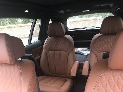宝马X7将会提供6座和7座两个版本,座椅布局分别为2+2+2、2+3+2,其中6座布局第二排座椅可选装类似头等舱的豪华座椅。此外,新车还搭载了三段式天窗,其中第三排上方为独立式设计。后备厢门开启方式与X5相同,为上下分段式开启。
