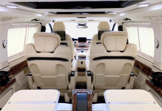 奔驰V250改装商务车房车价格内部装饰充满法国式的浪漫,九宫格灯珠镶嵌的椭圆形豪华顶棚造型设计气势磅礴,沿车身走向,两端与驾驶室隔屏和后门相衔接,形成古典对称的流线型图案。