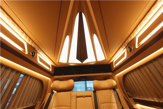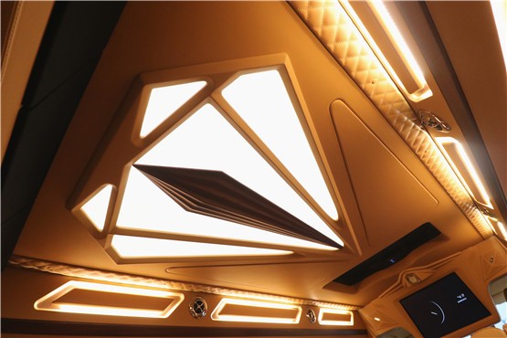 车内为了体现内饰的豪华程度,在车顶和车侧壁搭配了许多光源设计,车顶钻石形状车顶,两侧多处的氛围灯带,让人倍感温馨。