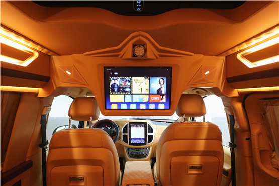 奔驰威霆商务车在后部贵宾仓车顶还加装了车载家庭影音系统,虽说是中低端商务车,但是这内饰可是实打实的豪华。