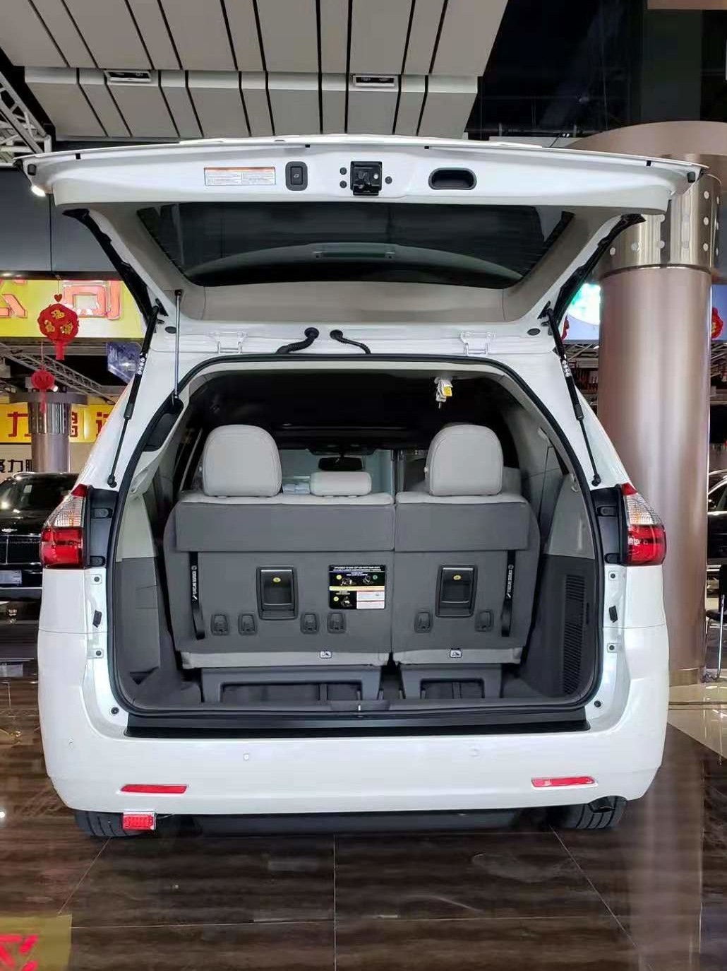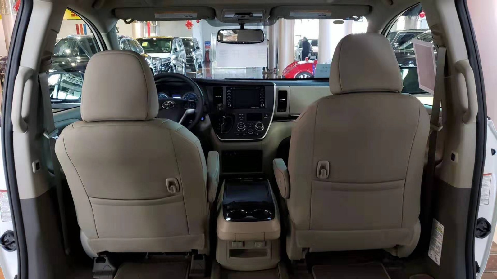 19款墨版丰田塞纳XLE 内部空间非常大,充分发挥了MPV的优势。 座椅全部采用双色真皮,第二排座椅的腿部支撑,放倒第三排座椅,加上腿部支撑,完全变成了两张摇篮床,让长途旅行多了一份舒适。宽敞舒适后座空间,配上该车安全稳定的行驶系统,保证途中也能舒适地谈上生意。